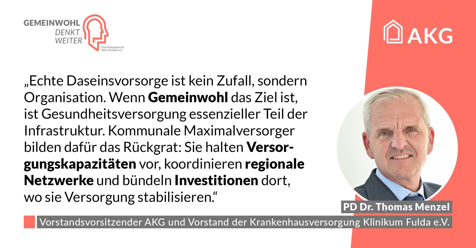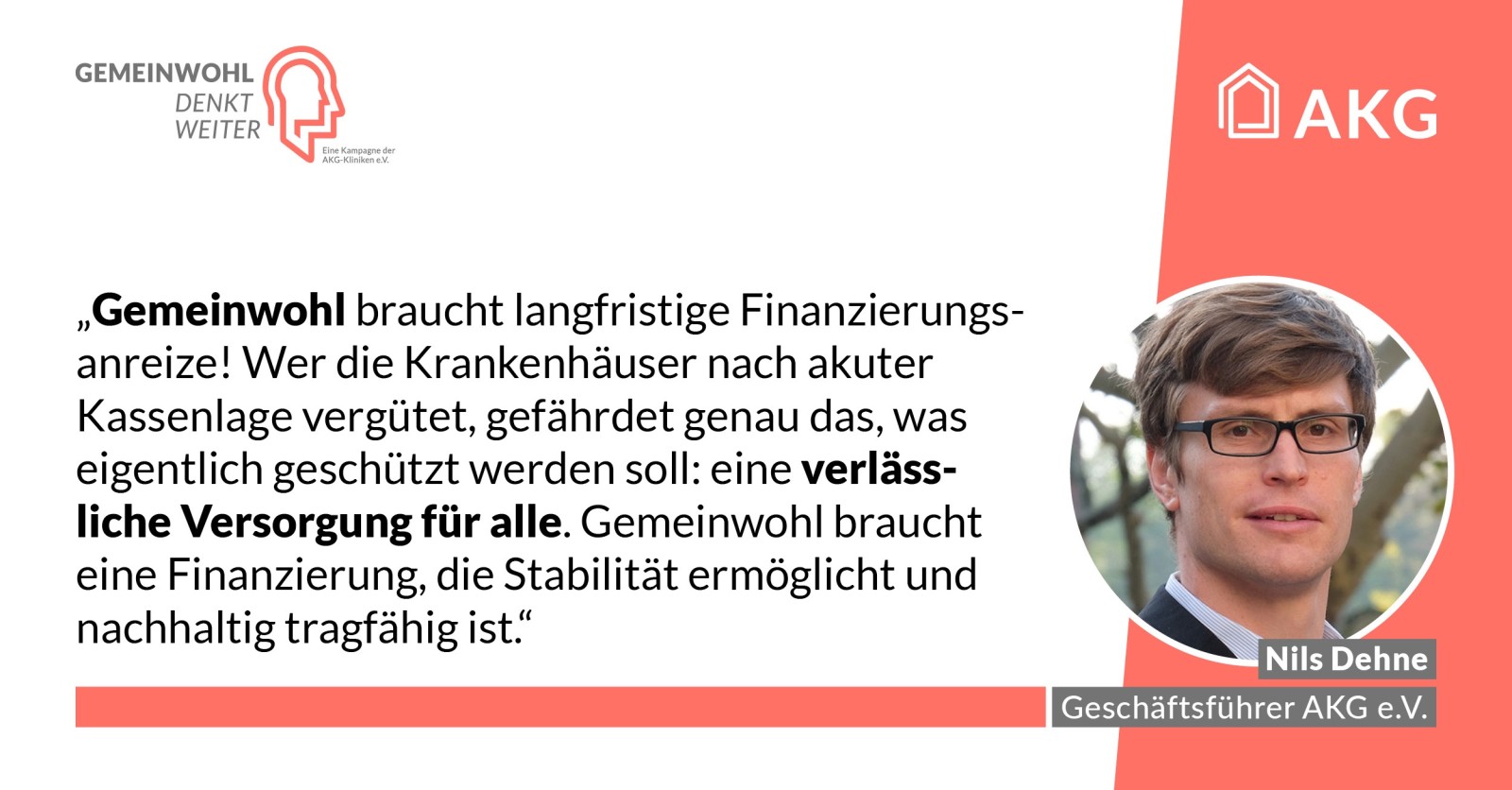 Gemeinwohl ist die Fähigkeit einer stabil organisierten und verlässlich finanzierten Gesundheitsversorgung, für alle da zu sein, im Alltag wie im Ernstfall. Das erreichen wir nur durch verlässliche Organisation inklusiver klarer Zuständigkeit, die die Vorhaltung von Leistungen sowie die Notfallfähigkeit der Kliniken absichert.